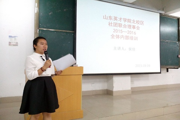 2015年9月11日,英才学院北校区社团联合理事会在B楼100教室举办社团联合理事会15级全会。主持本次会议的是社团联合理事会的主席侯佳,以及参加本次会议的各部门部长和各个社团社长。