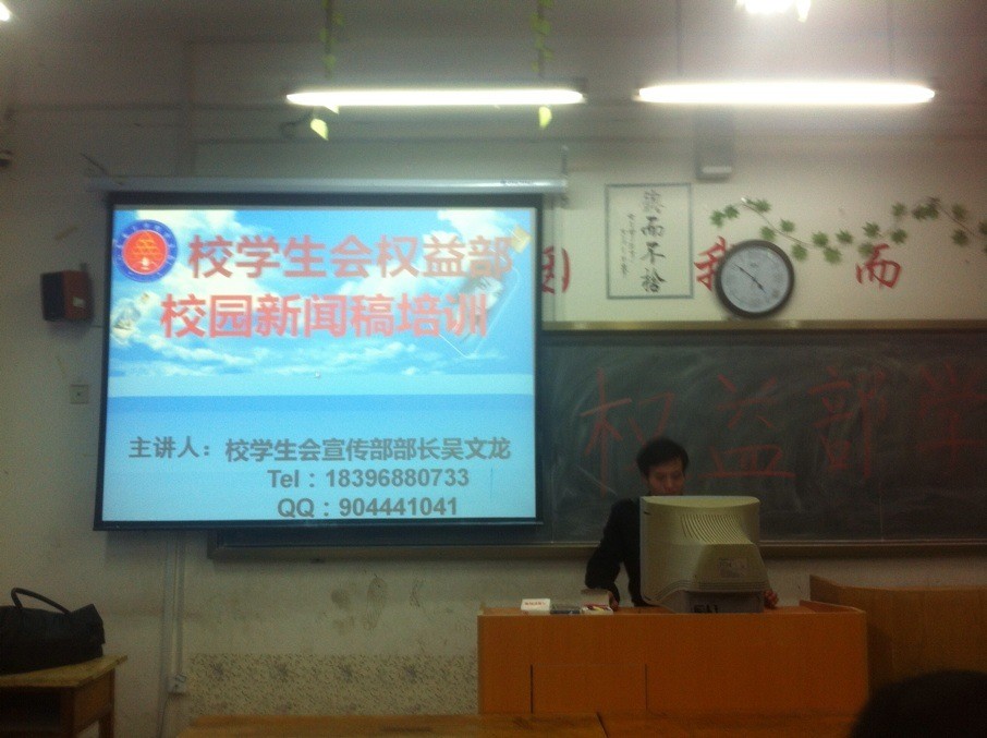 为了提高部门宣传质量,做好部门宣传工作校学生会权益部于 2013年12月12日 在B楼1016教室召开部门学习会。本次会议邀请的是校学生会宣传部部长吴文龙来为大家进行新闻稿培训,权益部全体干事积极参加了本次培训。本次会议由校学生会权益部部长高杰主持。