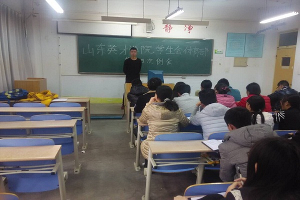 万里无云,日丽风清,2015年12月10中午11:40,在山东英才学院办公楼3007教室召开了学生会体育部第十四次例会,参加例会的成员有体育部部长刘斌,校学生会体育部全体大一成员,这次例会由王元政主讲。