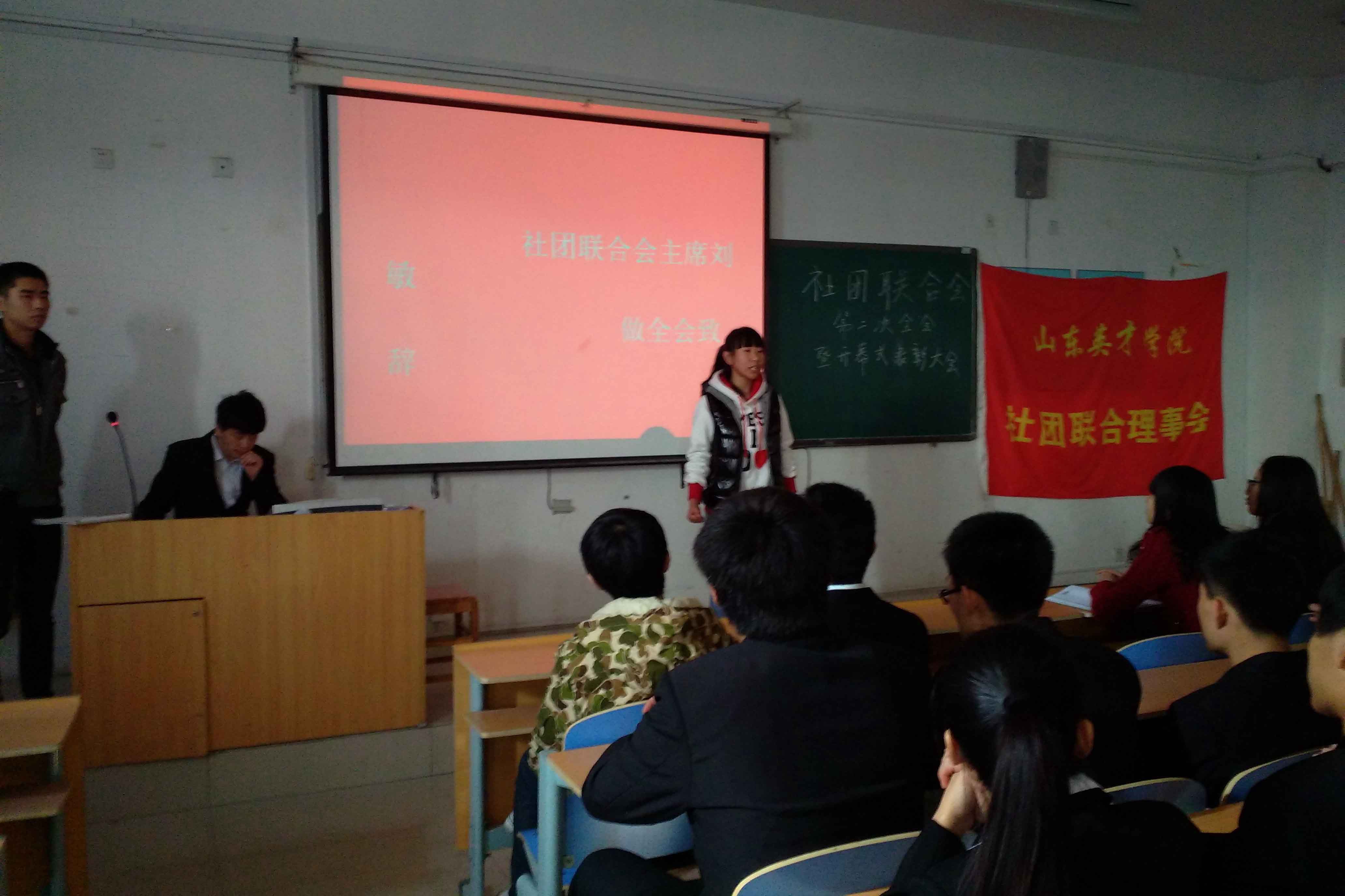 14年11月14日中午12点在综合南楼6008教室开始社团联合会第二次全会,参会人员有社团联合会主席刘敏,副主席李爽、邹广鹏和各部门部长及其干事。