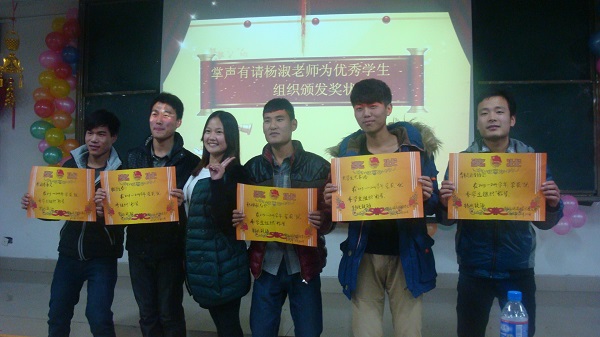 在一阵欢乐的气氛过后,进入了今晚的年终表彰颁奖典礼环节。首先是“优秀部员”颁奖环节,由各个组织负责人为优秀部员颁发奖品,并且合影留念。接着是“先进个人”颁奖环节,同样由负责任为获奖者颁发荣誉证书并合影留念。最后是“优秀学生组织”颁奖环节,由杨淑老师亲自为各个学生组织负责人颁发奖状并且合影留念。