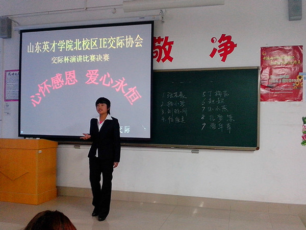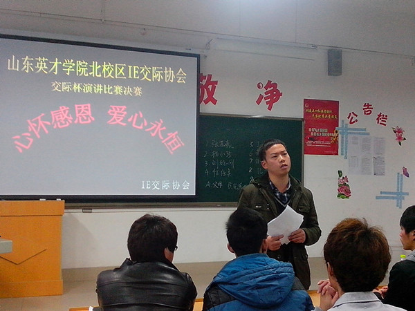 11月26日,由IE交际协会举办的以“心怀感恩,爱心永恒”为主题的交际杯演讲比赛决赛在教学楼B―317成功举办。本次活动请到的评委及嘉宾有北校区社团联合会主席赵维海、社联公关部部长孟祥新、IE交际协会会长李正友、E时代信息工程协会会长姜干伟、阳光木社团会长李玉斌、阳光木社团副会长张洪、理想园摄影团队会长侯佳和阳光文学社社长王军青。