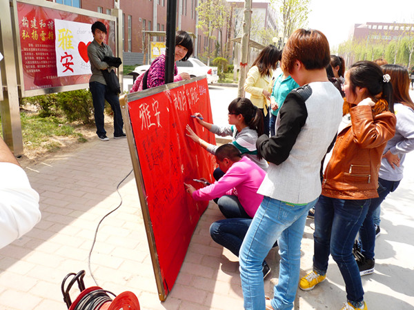 4月24日,由北校区英博嘉年华、英语俱乐部、艺星文学社和洪德健身俱乐部社团共同举办的“雅安,我们与你同在”签名活动,在北校区餐厅北门举行。