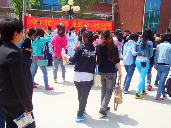 5月10日由北校区夏裳汉服社发起了主题为“汉服不仅是一件衣服,更是汉族人身份的象征”的大型签名活动,活动在北校区餐厅北门举行。