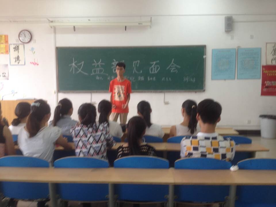为了增加新成员之间的感情交流,让各位新成员相互熟悉,相互了解,校学生会权益部于2014年8月28日11:40在综教楼4007教室召开初试通过成员见面会。出席本次会议的有校学生会副秘书长李婧雯、校学生会副主席王永浩、权益部部长高杰、权益部13级优秀骨干王倩琳、李一妹。通过初试的14级新成员参加见面会,王倩琳主持见面会。