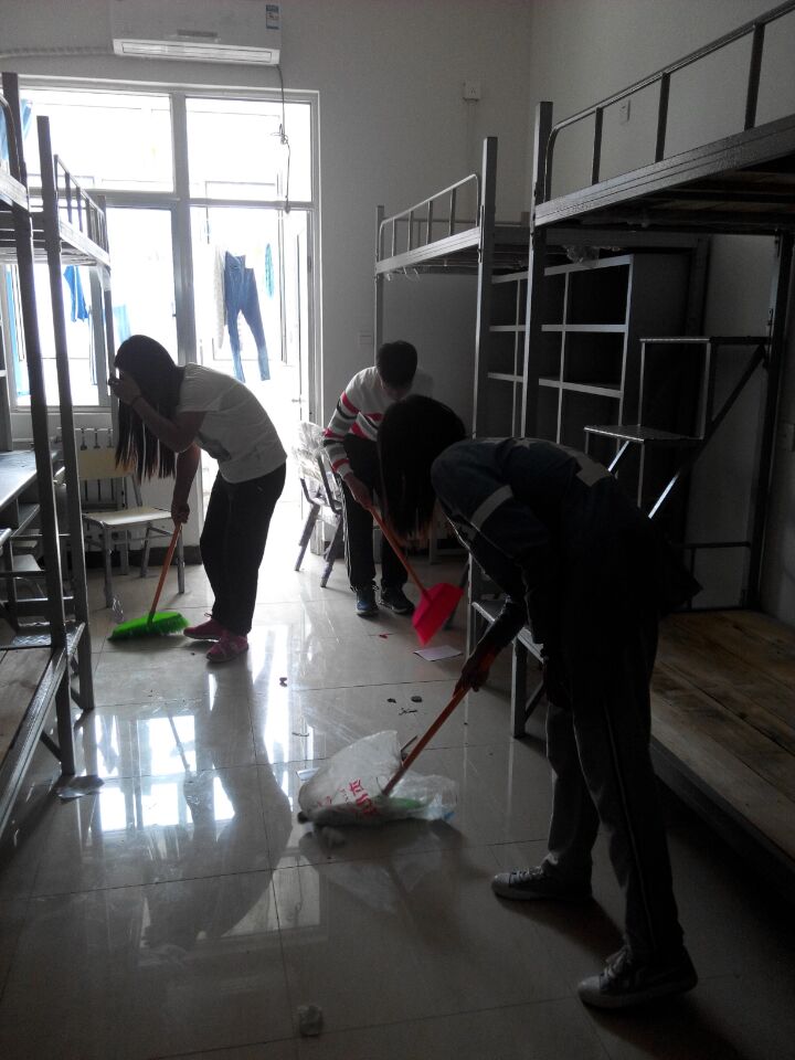 为迎接南校国际班同学迁到北校,校学生会成员与宿舍管理科在分管主席毛燕东的带领下于9月16日中午对五号公寓和七号学生公寓进行内务打扫。