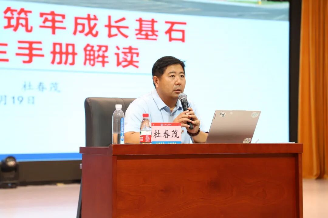 学生工作处杜春茂老师详细介绍了学校的发展历程与文化底蕴,并对学生手册及相关法律法规进行深入解读。通过具体案例,杜老师说明了违纪行为的后果及上报流程,强调同学们应自觉树立规矩意识、严守校纪校规。他鼓励大家尽快调整心态,积极适应大学生活,遵守校园管理规定,以实际行动书写精彩大学篇章。