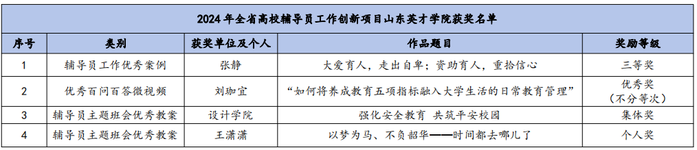 近日,中共山东省委教育工委公布了2024年全省高校辅导员工作创新项目获奖名单。我校斩获4项奖项,其中辅导员工作优秀案例1项,优秀百问百答微视频1项,辅导员主题班会优秀教案集体作品获奖1项、个人作品获奖1项,实现该项评选中的历史性突破,充分展现了山东英才学院在思想政治教育工作领域的创新成果和育人实效。