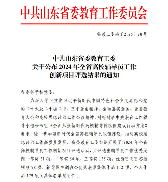 全省高校辅导员工作创新项目评选工作由中共山东省委教育工委组织开展,是加强新时代高校辅导员队伍建设、提高思想政治工作质量的一项重要举措。我校高度重视此项工作,积极组织申报,严格把关作品质量,最终选送的作品充分展现了我校思政工作的创新成果。此次获奖,不仅是对学校学生教育管理工作创新成效的高度认可,也是学校辅导员队伍长期扎根育人一线、默默耕耘的生动体现。