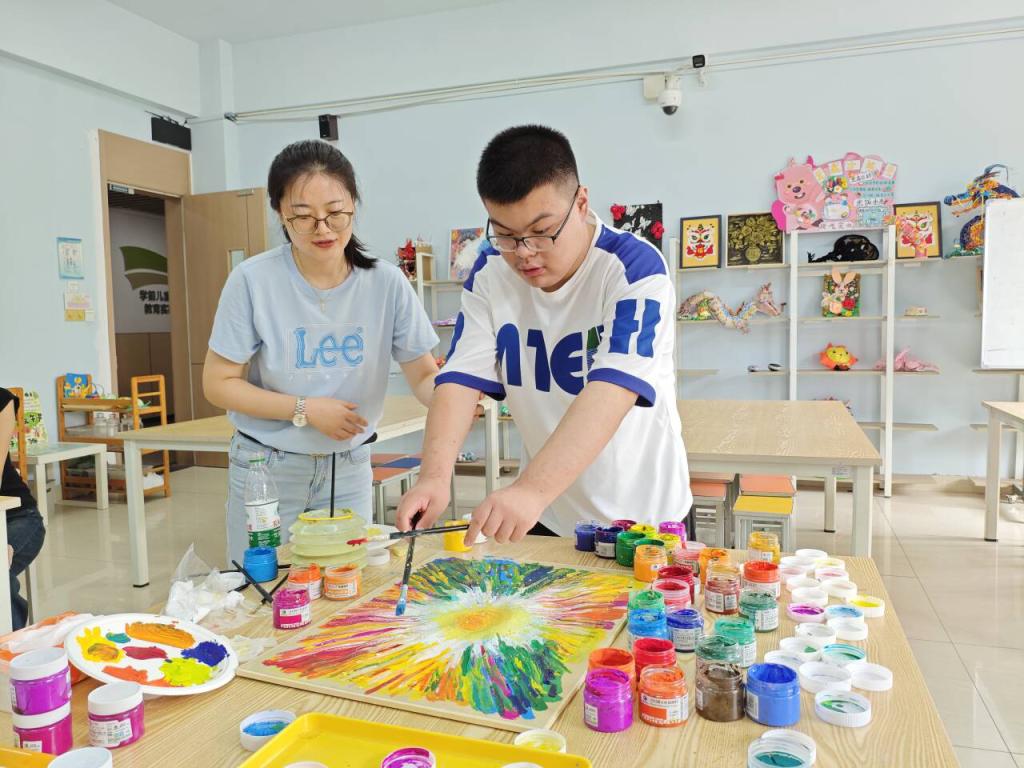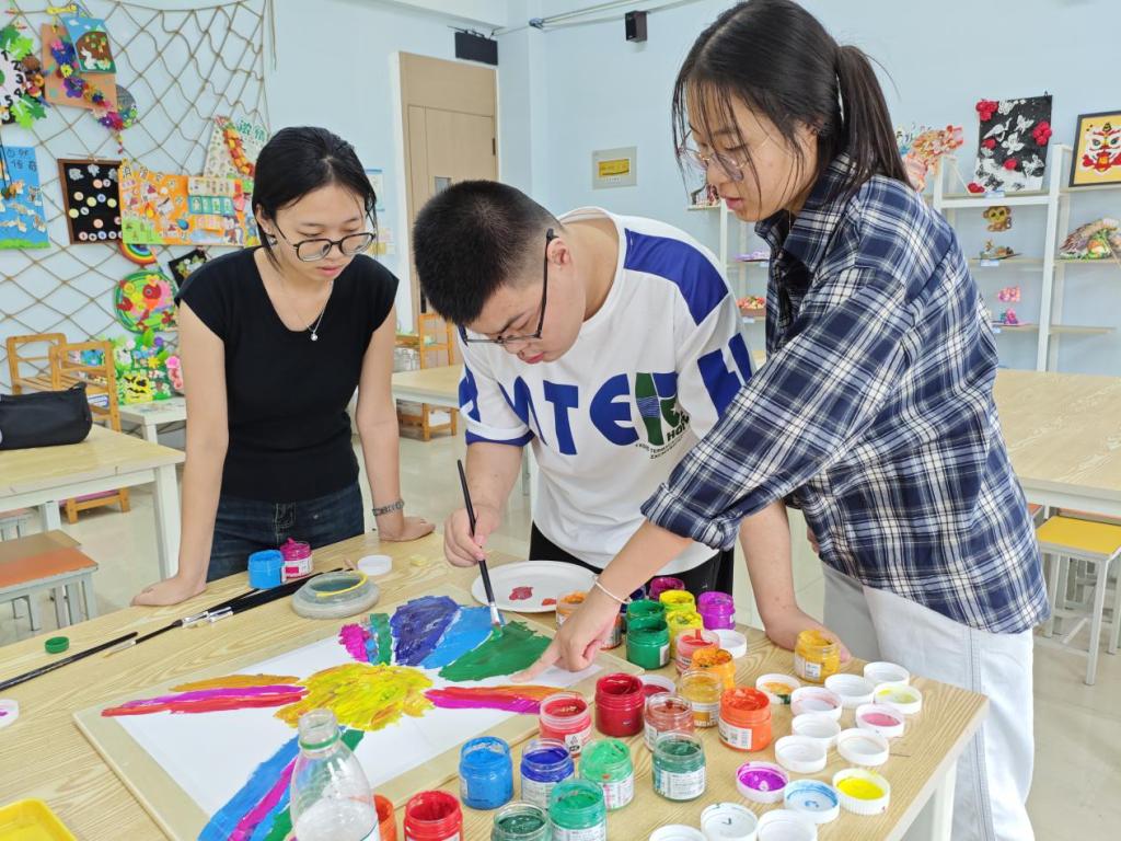 2025年9月12日上午,一场以“自由玩耍·艺术心语”为主题的特殊儿童艺术体验活动在山东英才学院学前教育学院国家级实验教学中心实验室温情举行。来自济南乐橄儿智障人士服务中心的学员董昌昊,在艺术指导老师杨春凤的引领和志愿者郑心竹、陈毅、高金苗、孙红羽的陪伴下,用画笔书写内心的童真与梦想。本次活动得到了学前教育学院领导的密切关注与大力支持,为孩子们搭建起了一个自由表达与艺术交流的平台。