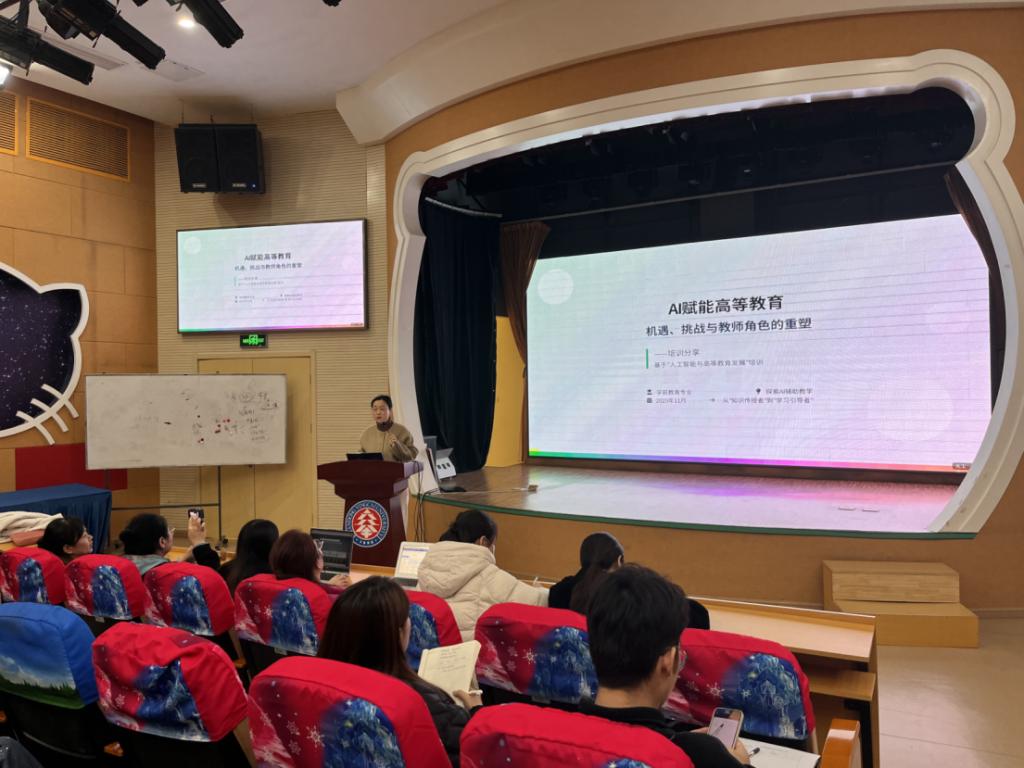 2025年11月4日下午,学前教育学院小剧场内气氛热烈,一场以“AI赋能高等教育:机遇、挑战与教师角色的重塑”为主题的青训培训在此拉开帷幕。本次培训由我院资深教师范夏老师主讲,全体青年教师齐聚一堂,共同探索AI技术为高等教育带来的新机遇与新挑战。