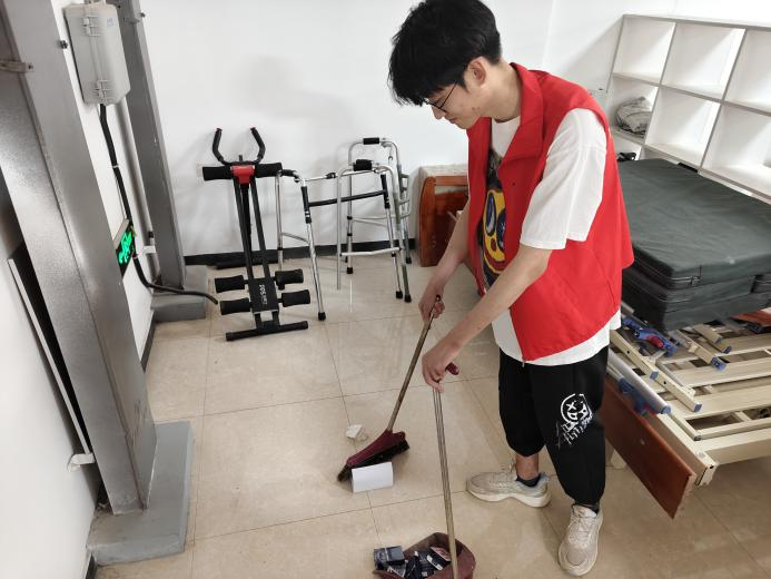 成员们对活动室进行清洁,完成地面除尘、器械消毒等标准化清扫流程。