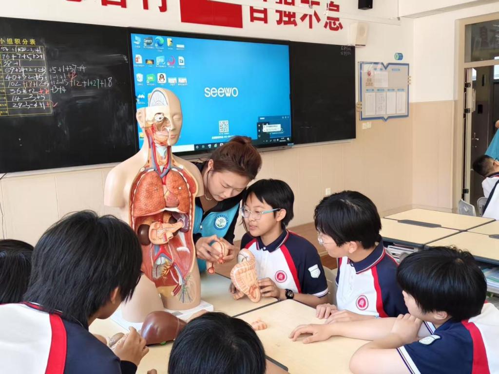 宣讲结束后,活动进入到知识问答环节。老师及志愿者们通过3D解剖模型为学生们讲解人体的各个器官及其作用知识,带领学生们探索身体的奥秘,提醒学生们日常关注身体变化。