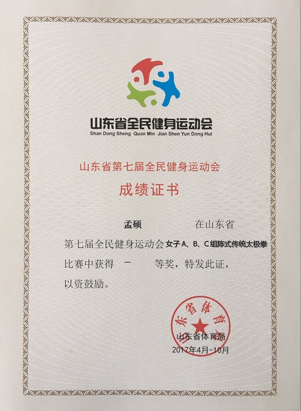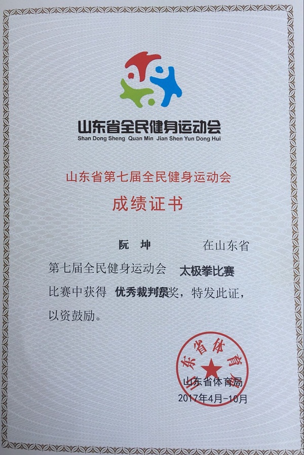 4月24日,“中国体育彩票”山东省第七届全民健身运动会太极拳比赛在烟台落幕,此次比赛共有来自全省31支代表队468名运动员参赛。山东英才学院公共体育教学部阮坤老师带领4名运动员参赛。