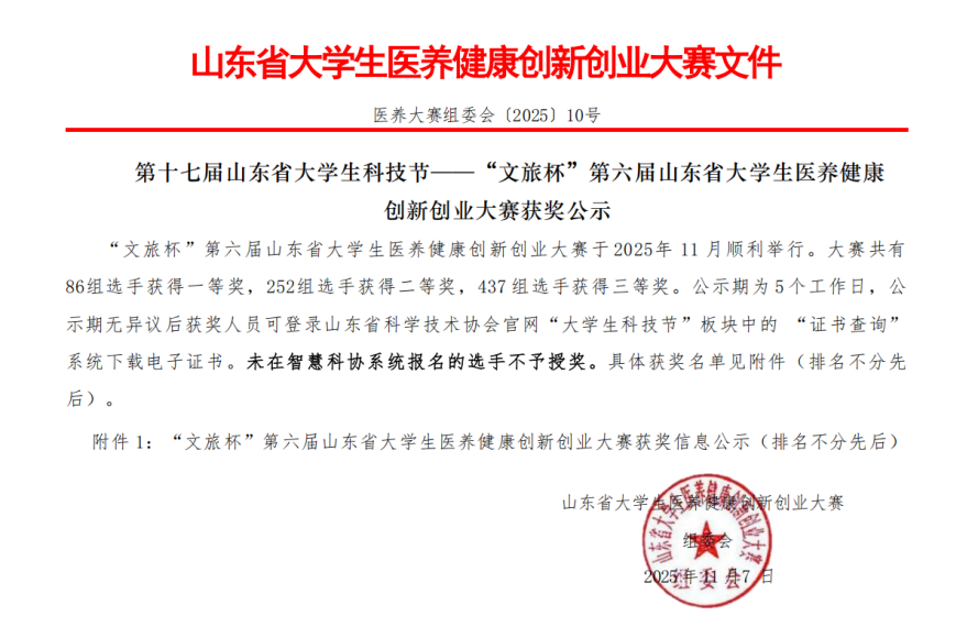 2025年11月5日—11月7日,第十七届山东省大学生科技节“文旅杯”第六届山东省大学生医养健康创新创业大赛决赛在曲阜远东职业技术学院高铁校区圆满举行。本次大赛聚焦行业痛点与民生需求,来自全国13个省份74所院校的870支队伍、近8000名优秀学子晋级决赛,我校医学院参赛项目脱颖而出,成功斩获两项省级荣誉。