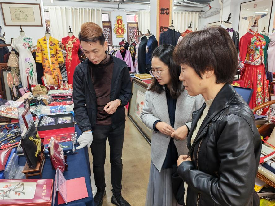 为推动传统非遗工艺与现代设计教育深度融合,探索协同育人新路径,11月9日,设计学院服装与服饰设计专业师生代表一行前往济南戴记鲁绣旗袍店,与非物质文化遗产传承人、品牌主理人戴军先生展开深度交流。双方围绕人才培养、设计创新、文化传承等核心议题达成高度共识,共同搭建非遗传承与设计实践的合作平台,开启校企携手发展的新篇章。
