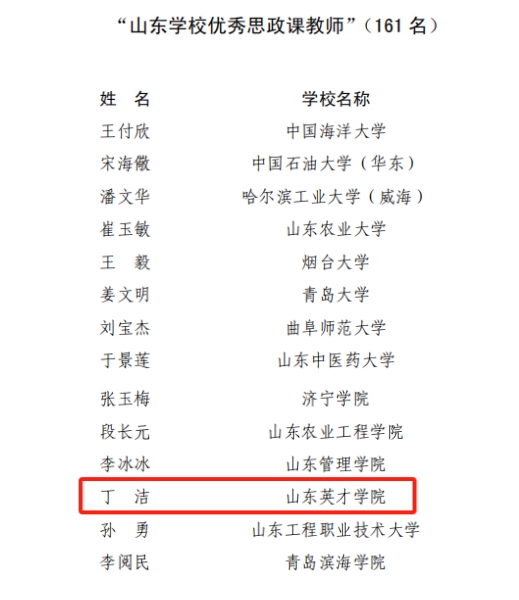 近日,中共山东省委教育工委公布2023年度“山东学校思政课教师年度人物”“山东高校辅导员年度人物”宣传选树结果,山东英才学院马克思主义学院教师丁洁获评“山东学校优秀思政课教师”称号。