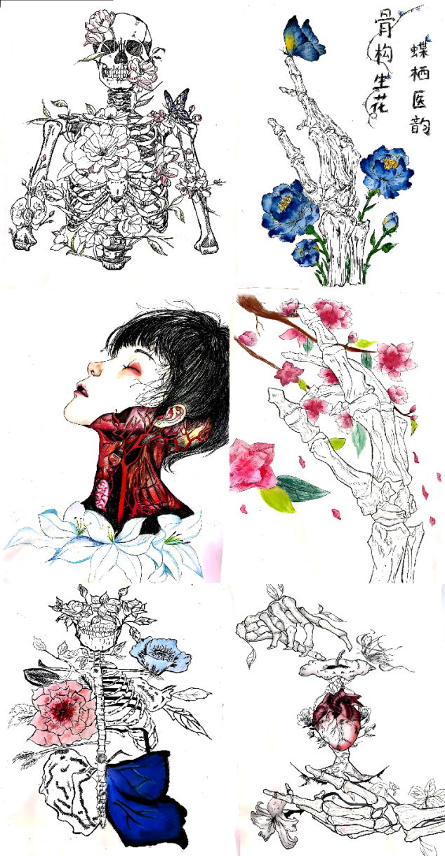 经过网络投票,作品《骨生花:解剖之光》脱颖而出,获得一等奖。“当肋弓化作花瓶,颅骨成为静物,科学剖开胸膛,却让一朵玫瑰代替心脏继续跳动。”《人体解剖学》课程负责人徐莉老师说。教学院长王世芳说:“如果解剖学有颜色,今天它一定是同学们调色盘上的红。”