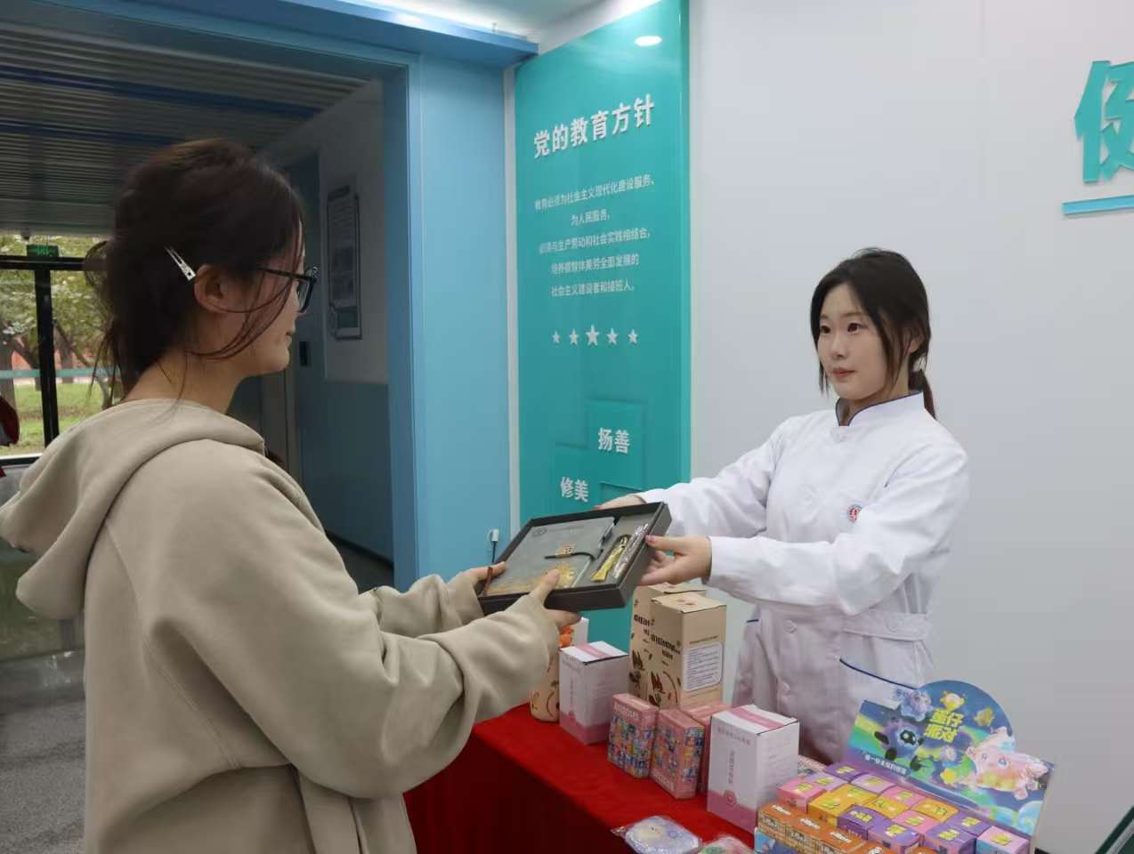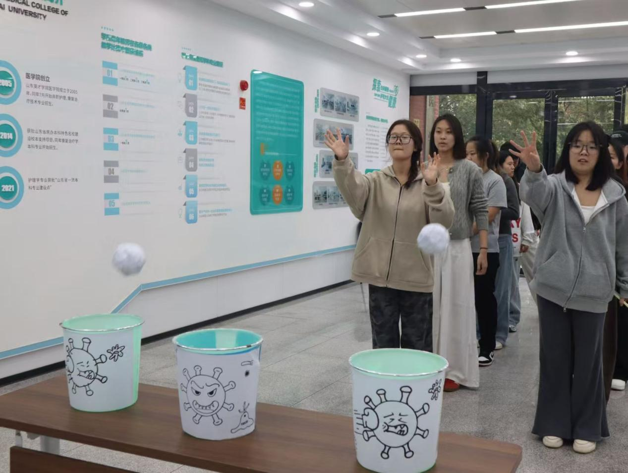 “细菌怪兽”保龄球游戏创意十足,桶上画上“细菌”表情化身“怪兽”,它将抽象的医学知识转化为一场充满想象力与竞技乐趣的实战。 让同学们在 互动中,深刻领悟到手部卫生作为“第一道健康防线”在阻断病原体传播中的关键作用。