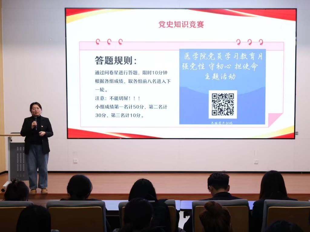 11月20日,医学院于107教室举办党史知识竞赛。竞赛以“以赛促学、以学促行”为核心,通过小组分组形式展开:首轮借助问卷星答题角逐出前八名,随后以紧张的抢答题环节筛选出四强,最终通过风险题比拼决出名次。整场竞赛既考验了学子们的党史知识储备,也在激烈的角逐中加深了大家对党的历史与精神的理解,让党史学习教育从“理论”走向“实践”,激励医学院青年在以赛悟史中厚植信仰、践行使命。