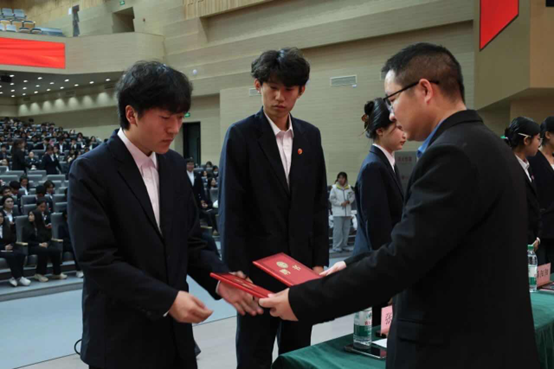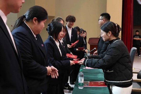 年级长张乐雷首先宣读《关于2025级班委及朋辈导师的聘任决定》,明确了新一届学生骨干的任职要求与责任使命。随后,在热烈的掌声中,张国栋副书记及各位年级长依次为受聘同学颁发聘书,一纸聘书承载着学院的信任与期望,标志着2025级学生骨干队伍正式接过责任接力棒,开启履职新征程。