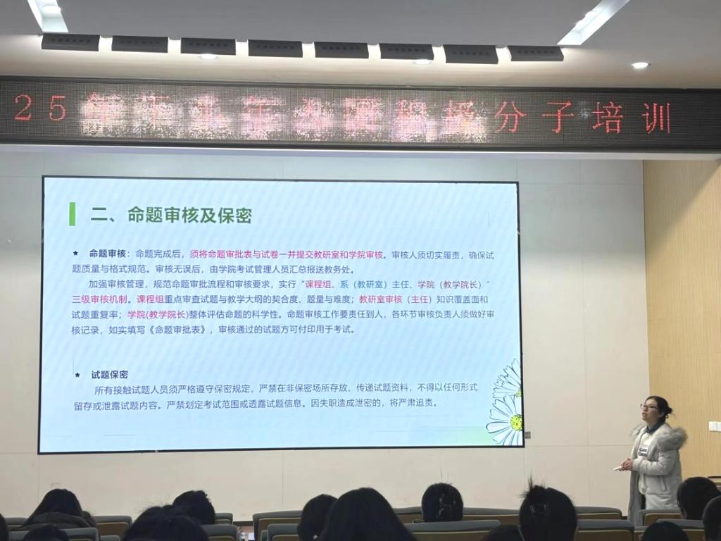 会议首先明确了命题核心要求,试卷格式要严格遵循学校统一模板。特别强调同一门课程需成立命题小组集体命题、统一试卷及考试时间。同时,会议要求遵循“课程组、系(教研室)主任、学院(教学院长)”三级审核机制,着重强调试题保密纪律,要求所有接触试题人员严禁在非保密场所存放传递试题、留存泄露内容,严禁划定考试范围或透露试题信息,失职泄密将严肃追责。