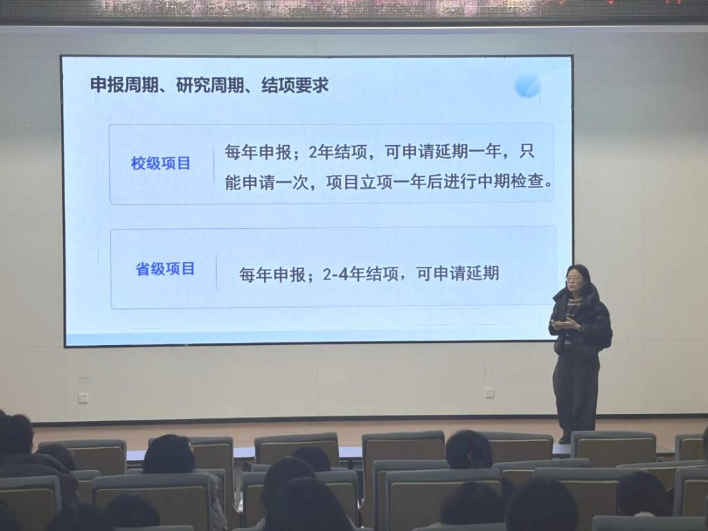 会上,韩老师首先围绕申报周期、研究周期及结项要求三大核心要素展开解读,详细梳理了申报的时间节点、研究周期的合理规划方法,以及结项时需满足的成果要求、材料规范等关键内容,帮助教师们厘清项目推进的时间脉络与核心标准。此外,针对教师们高度关注的奖励资助办法与推荐限额问题,进行了重点说明。随后,韩老师鼓励教师们立足教学实际,紧扣政策导向与产业需求,挖掘具有创新性、实用性的研究课题。
