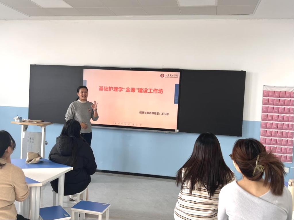 汇报中,王玉珍老师明确了“金课”建设核心目标:以OBE理念重构《基础护理学》课程,融入老年护理案例,打造系部样板课程,力争申报校级“金课”并培育省级课程建设项目。针对当前教学问题,会议通过诊断梳理明确建设方向,会上部署了具体任务,确立“三融合、三递进、三协同”优化原则——老龄特色、智慧技术与课程思政深度融合,构建基本技能到创新应用的递进式培养路径,形成校医企协同育人机制。