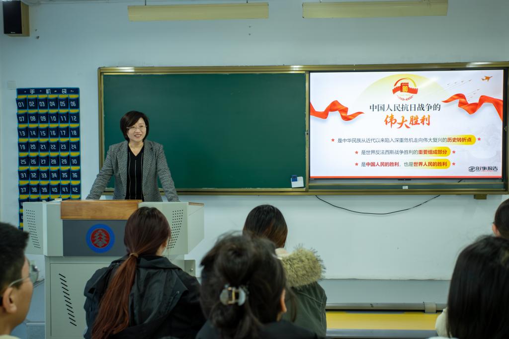 党委副书记、工会主席孙玉香以纪念抗战胜利80周年为契机,带领同学们回顾救亡图存、烽火连天的岁月,引导大家从中汲取民族从苦难走向辉煌的磅礴力量,启发学生思考在民族复兴的征程上,新一代青年该如何担当作为。这是一堂厚植家国情怀、凝聚奋进力量的“思政必修课”。