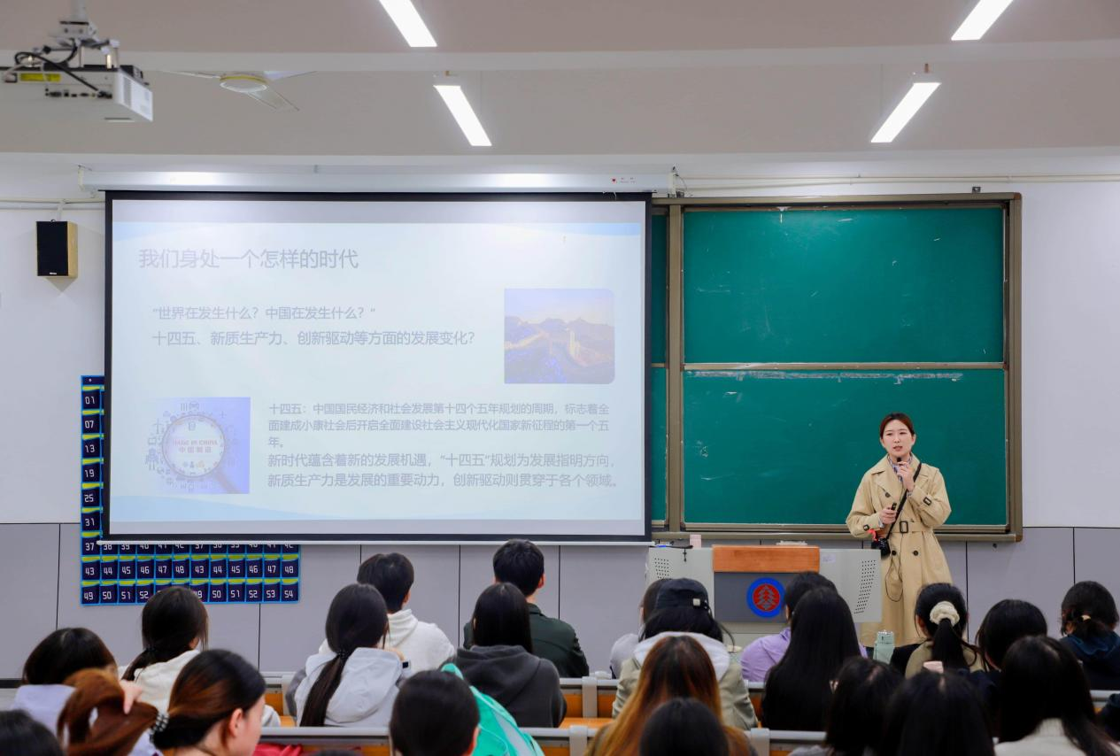 党委委员、党委宣传部部长王坤丽以“十四五”规划实施以来的“国家答卷”为切入点,将宏观政策与微观实践紧密结合,用一组组鲜活数据、一个个典型案例,系统梳理了我国在科技创新、乡村振兴、教育公平、生态保护等领域取得的突破性成就,让“十四五”规划从“文件文本”变成了同学们可感可知的“发展实景”,整堂思政课互动频繁、氛围热烈。