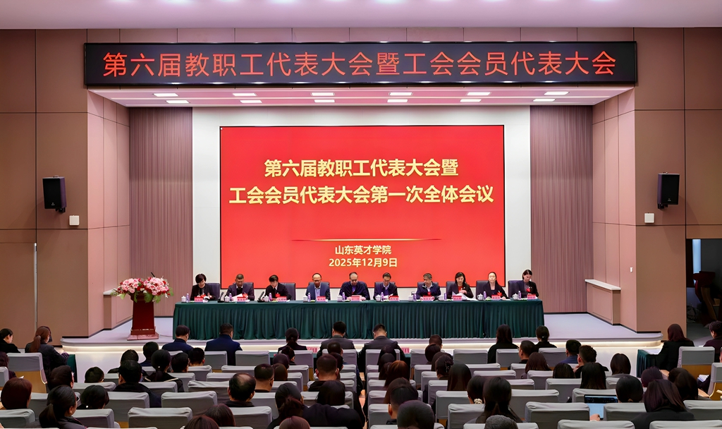 2025年12月9日,山东英才学院第六届教职工代表大会暨工会会员代表大会在南校区学术报告厅隆重举行。山东省教育工会委员会二级调研员王辉,济南市教育工会主席任树军,济南高新区管委会主任助理、高新区总工会主席宋丰华出席开幕式并致辞。学校顾问校长张星臣,党委副书记、执行校长王晓娜,党委副书记、工会主席孙玉香,副校长崔奎勇,纪委书记、副校长李晓玲,副校长孙文红,校长助理张瑞君,正式代表、列席代表等170多人出席会议。
