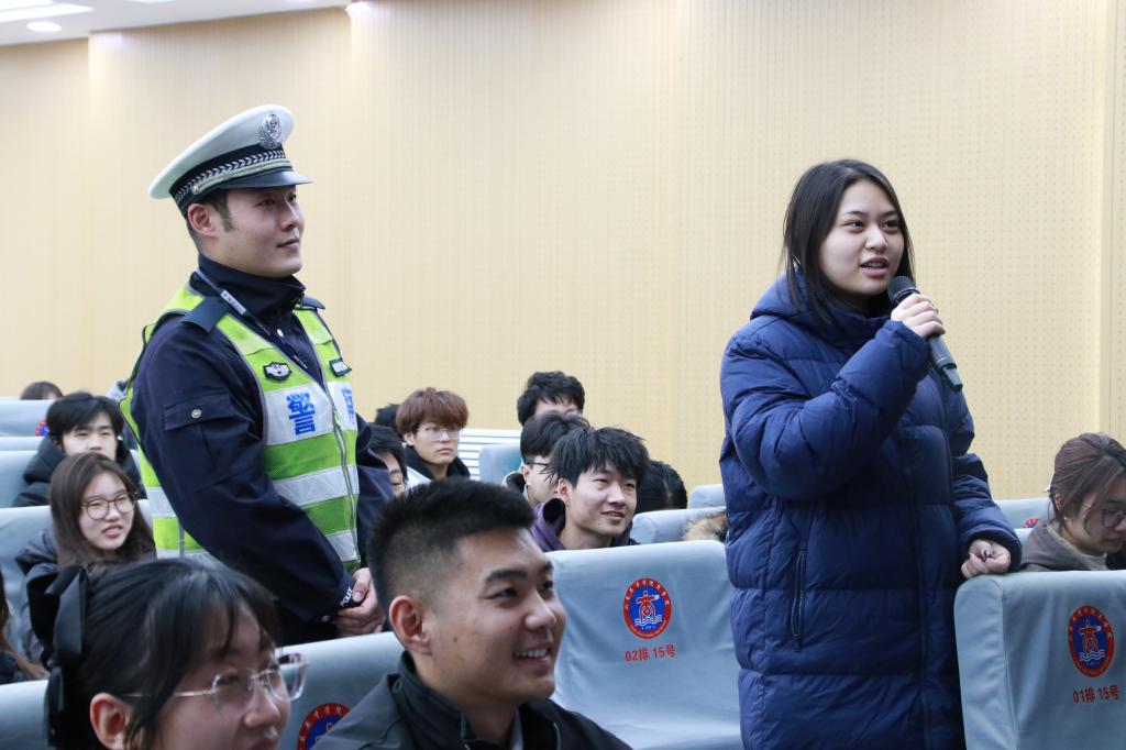 冯庆昊警官则借助近期辖区周边的重大交通事故案例视频,以案说法,直观再现事故现场,深刻剖析事故成因。他向师生详细讲解了预防交通事故的基本方法,提醒大家在驾车时要远离大型货车、杜绝超速、分心及违章驾驶,务必重视交通法规,做到“做文明人、行文明路”。讲座还设置了有奖问答环节,学生们积极就日常出行中的交通困惑提问,冯警官一一给予专业细致的解答,现场气氛严肃而热烈。