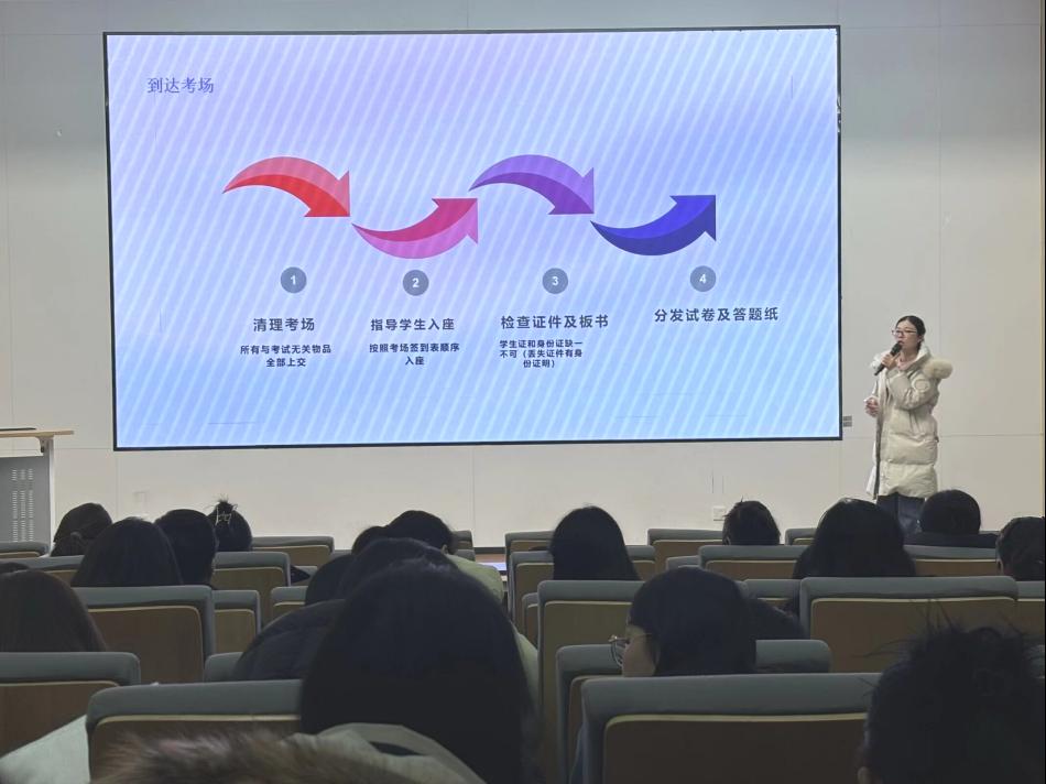 随后,培训会聚焦期末考试考务工作。秦老师详细讲解了期末考试监考全流程,从考前30钟领取材料、考场清理,到证件核查、违纪处理,再到考后试卷整理装订,强调全程规范操作。针对可能出现的突发情况,培训会详细介绍了应急处理流程,确保一旦发生意外能迅速响应、妥善处置,保障考试的公平公正和顺利实施。