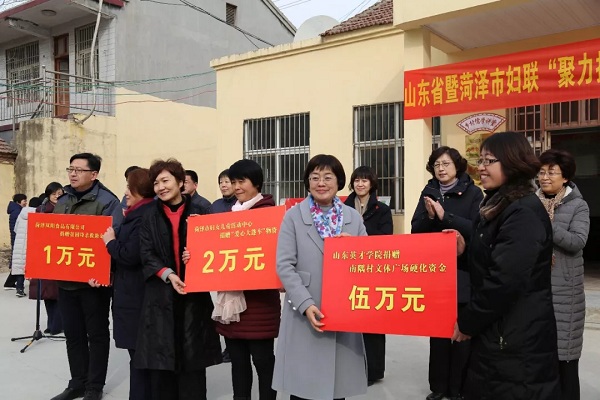 2月10日,山东省暨菏泽市妇联“聚力扶贫 巾帼送暖”活动走进省妇联“第一书记”帮包村——田庄镇南隅村、东隅村。省妇联主席张惠、副主席孙应琢、菏泽市副市长侯婕,省体育局、巨野县有关领导及省、市、县妇联有关同志参加活动。省妇联常委、我校董事长杨文参与活动并为当地捐款5万元。