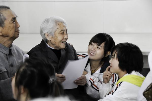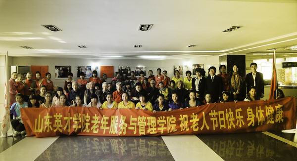 金秋十月,硕果飘香,在这丰收喜庆的日子里,为继承和发扬中华民族的传统美德,展现山东英才学院师生尊老敬老爱老的精神风貌,进一步营造尊老、敬老、爱老、助老的社会风尚,激发师生孝老爱老的自觉性,了解老年服务与管理的内涵,2012年10月18日,在老年服务与管理学院的副院长于志芳和牛海征的带领下,老年服务与管理学院师生与济南市第一老年公寓的老人们共同庆祝即将到来的传统佳节“重阳节”。