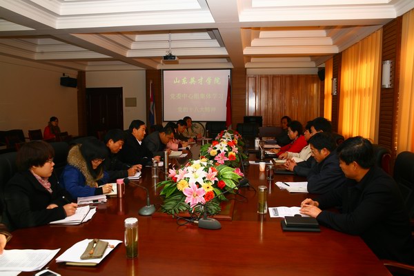 为深入学习领会和贯彻落实党的十八大精神, 11月19日上午,学院党委中心组在A楼大会议室集体学习十八大精神。学院副院长刘翠兰、梁庆文、张宗胜,党建联络员武传春,以及党委、纪委成员、党办、宣传部、组织部、统战部、学工部负责同志参加学习,副院长刘存刚列席学习会,学习会由党委委员、副院长刘翠兰主持。