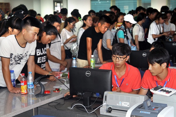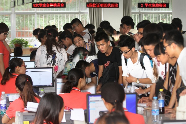 新生报到处人头攒动,一片忙碌景象。新生们在学校志愿服务人员的引导下,在家长的陪同下,按照流程先后报到注册。虽然人多,但有条不紊,学校领导、老师现场指挥协调,志愿者们忙前忙后做了大量服务作,引导新生有序地报到入学,整个过程忙而不乱,校园里到处都是热情洋溢的笑脸,回荡着来自天南海北的方言乡音。
