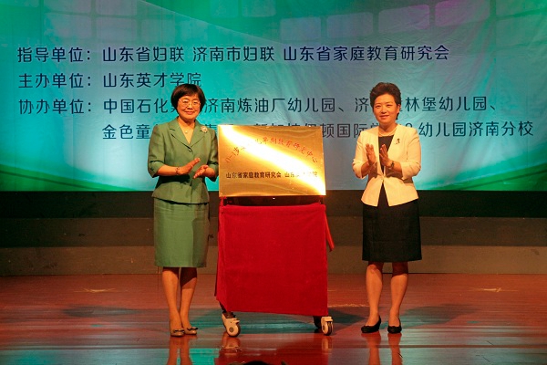 省妇联主席邢善萍与我校董事长杨文共同为“0-3岁婴幼儿早期教育研究中心”揭牌。院长夏季亭和学前教育学院院长宋占美共同为全省各地20家首批“英才贝贝实验基地”授牌。