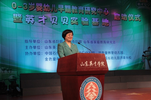 我校董事长杨文在致辞中指出,“0-3岁婴幼儿早期教育研究中心”是在省妇联邢善萍主席、任月英主席的亲自关怀、支持和指导下,在省、济南市、历下区妇联和山东省家庭教育研究会统筹协调下成立的。这充分体现了各级妇联对妇女成长发展和孩子成长教育的重视和支持,体现了各级妇联与时俱进、积极适应并引领经济社会发展新常态的远见卓识和创新智慧,体现了各级妇联关注民生、积极助力民生难题的社会责任和胸怀格局。她表示,英才学院将尽全力依托研究中心将婴幼儿早期教育研究推向一个新的高度,积极建设以“英才贝贝实验基地”为示范的早期教育服务品牌,为我省0-3岁婴幼儿早期教育的发展贡献绵薄力量。
