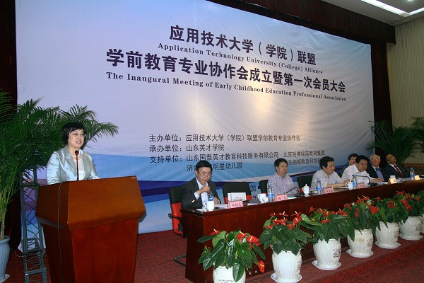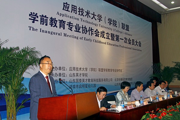 5月11日,由教育部应用技术大学(学院)联盟发起,我校牵头成立的应用技术大学(学院)联盟学前教育专业协作会成立暨第一次会员大会在我校召开。应用技术大学联盟秘书长闫舒静,山东省教育厅高教处处长王志田,我校董事长杨文,党委书记、院长夏季亭,学前教育学院院长宋占美等领导出席会议。华东师范大学教授,中国教育学会学前教育专业委员会理事长朱家雄教授,欧蒙教育集团专家、荷兰幼教专家杰夫教授受邀参会并作主题报告。来自华东师范大学、东北师范大学、云南师范大学、深圳国泰安教育技术股份有限公司、北京哈佛摇篮教育集团、济南启明星幼儿园、山东朗朗教育科技股份有限公司等55家高校、幼教行业的110余位代表参加会议。