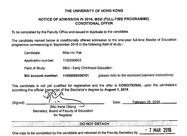 3月7日,我校学前教育学院2012级普本6班的胡悦同学接到香港大学的通知,被录取为教育学院硕士研究生,攻读方向为早期儿童教育(Early Childhood Education)。