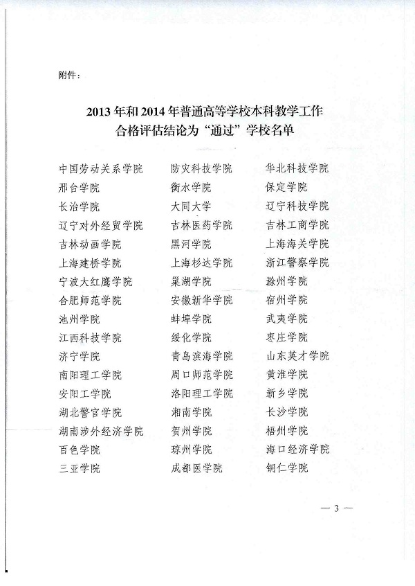 近日,国务院教育督导委员会办公室下发《关于公布2013年和2014年普通高等学校本科教学工作合格评估结果的通知》(国教督办函〔2015〕75号),我校顺利通过了2014年教育部的普通高等学校本科教学工作合格评估。