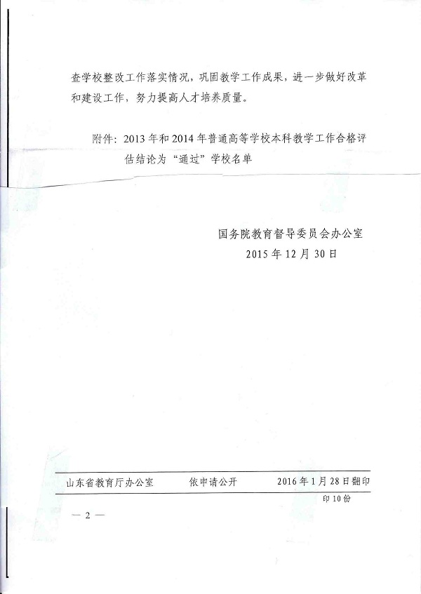 按照《教育部关于普通高等学校本科教学评估的意见》(教高[2011]9号)和《教育部办公厅关于开展普通高等学校本科教学工作合格评估的通知》(教高厅[2011]2号)精神,教育部于2013年和2014年完成了对全国64所普通高等学校的本科教学合格评估工作。据悉,通过本次评估的山东省高校为4所,我校名列其中。