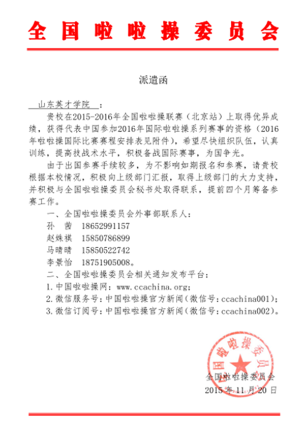 11月20日至22日,由国家体育总局体操运动管理中心、中国大学生体育协会、中国中学生体育协会主办,全国啦啦操委员会等承办的“2015-2016年全国啦啦操联赛暨中国啦啦操之星争霸赛(北京站)在对外经贸大学举行。我校啦啦操队作为山东省唯一的民办大学参赛,并取得了亮眼成绩。并于24日接到全国啦啦操委员会发出的代表中国参加2016年国际啦啦操系列赛事资格的派遣函,我校健美操队即将走出国门,踏上新的征程。