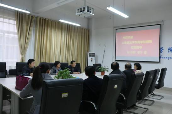 2015年11月11日,山东政法学院商学院刘丽霞院长、孙建全副院长、杨宝剑博士等一行到我校经济管理学院考察交流,经济管理学院院长张红旗、行政副院长王广柱、教学副院长张黎、实训中心主任钮小萌等院领导陪同参观考察并进行座谈交流。