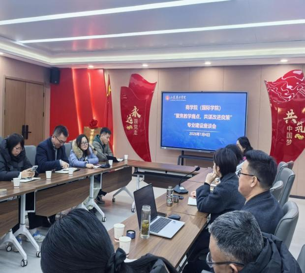 2026年1月4日,商学院(国际学院)在商学院楼408党员活动室举办以“聚焦教学痛点,共谋改进良策”为主题的专业建设座谈会。会议由商学院(国际学院)副院长王鸾主持,各专业负责人、教学骨干、教学督导及教学秘书参加会议,围绕专业建设核心议题深入研讨、共话发展。商学院(国际学院)党总支书记、院长赵坤出席会议并作政策解读与指导。