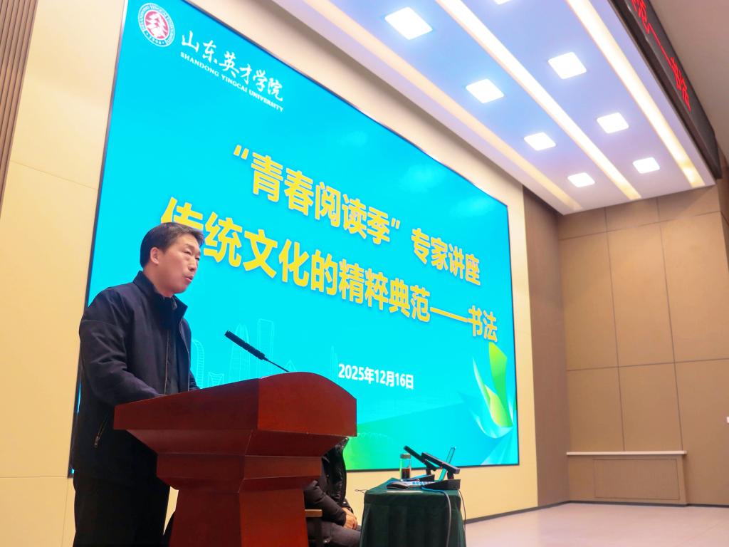 2025年12月16日上午,山东英才学院学术报告厅内墨香氤氲,由山东省宣传部“青春阅读季”活动指导、校图书馆主办的“传统文化的精粹典范——书法”主题讲座在此隆重举行。