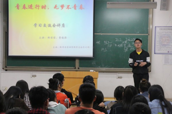 讲座伊始,韩苗苗同学就直言学习交流并不是单纯的上面的人在讲,而是所有的人一起分享学习心得与经验。韩同学谈到交的学费是应该拿自己的努力争取回来的。要有考研的目标,并且努力学好高数和英语,从大一抓起,订立每日目标并提早制定复习计划。韩同学结束演讲之后,一个简短的影片告诉我们梦想即坚持,这是让你感到幸福的东西,青春岁月,要为自己去争取,做更好的自己。在迷失自我的时候再问问自己能做什么。曹俊澎学长幽默风趣地讲述了其高考结束后的深刻体会,时隔几年再提起,当初齐聚英才,无非为了本科学历和争取更好的前程。曹学长为在座学生简要分析了四月份国考的详情以及未来几年大学生活的规划。