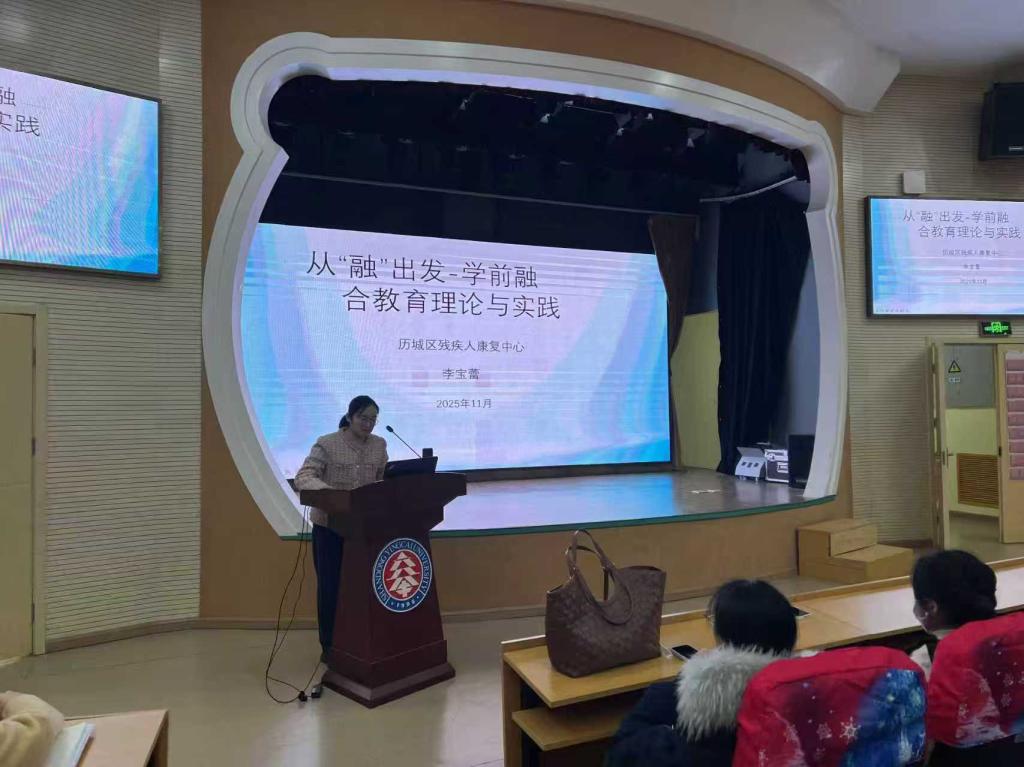 为深化融合教育理念,赋能学前教育高质量发展,2025年11月18日下午,学前教育学院特邀历城区残疾人康复中心主任李宝蕾,为全院教师带来一场题为《从“融”出发——学前融合教育理论与实践》的专题讲座。讲座由学院副院长任姗主持,学院全体教师齐聚一堂,共同探寻融合教育的理论真谛与实践路径,在教育情怀的共鸣中筑牢育人担当。