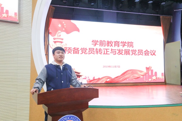2019年11月7日中午12:15,学前教育学院于学前教育学院一楼小剧场召开预备党员转正暨党员发展大会 。学前教育学院学生支部10名正式党员教职工、16名预备党员、37名发展对象参加会议。会议由学前教育学院党总支学生支部书记薛阳阳主持。